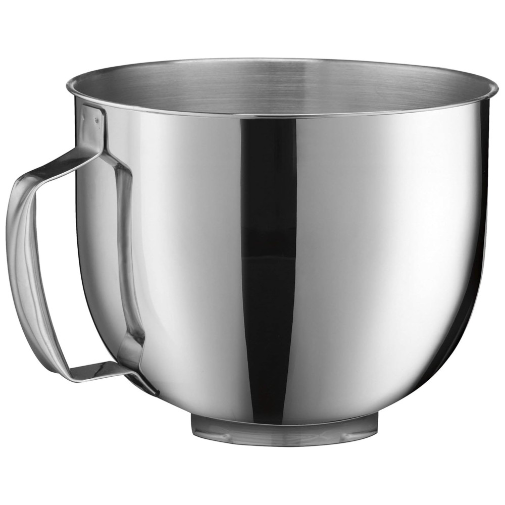 A capacidade da tigela é de 5,2 litros e ela é feita de aço inoxidável polido.