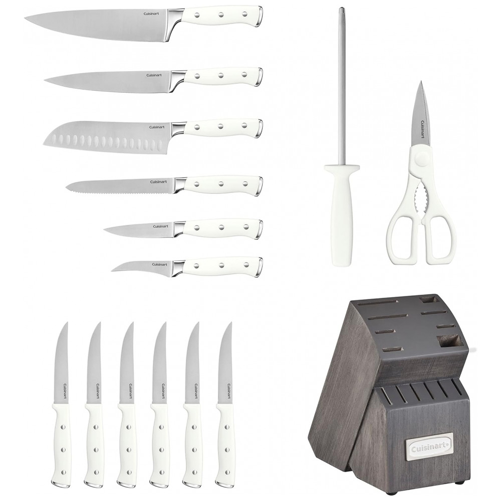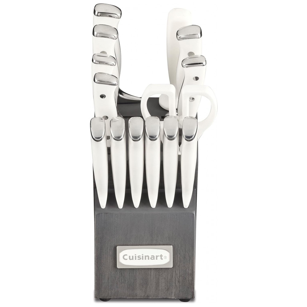 Conjunto de Facas Cuisinart em Aço Inoxidável com Bloco de Bancada, 15 Peças, Branco e Cinza: DESEMPENHO SUPERIOR Os talheres de rebite triplo forjado clássico da Cuisinart possuem lâminas superiores de aço inoxidável de alto carbono para precisão e precisão.