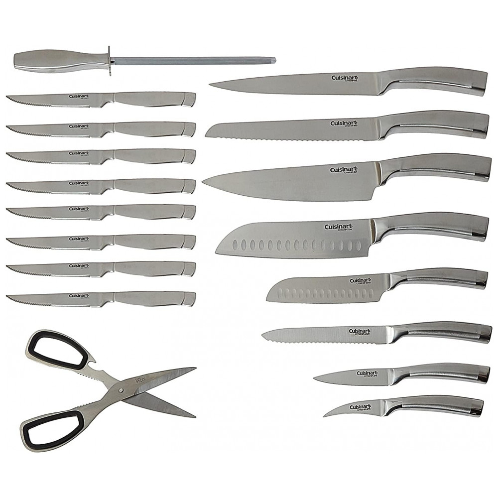 Conjunto de talheres, CUISINART C77SS 19P, Prateado: Lâminas superiores de aço inoxidável de alto carbono para precisão e exatidão Lâminas retificadas cônicas de precisão que estreitam gradualmente para uma borda extremamente afiada e fina Alça de aço inoxidável ergonomicamente projetada oferece conforto Bloco de design exclusivo se encaixa perfeitamente sob o gabinete para fácil uso Garantia de vida