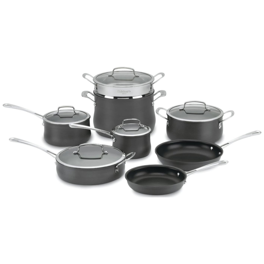 Contour Conjunto de Panelas Antiaderentes, Peças, CUISINART 64 13, Preto: Distribuição de calor insuperável a construção com núcleo de alumínio anodizado rígido aquece rapidamente e espalha o calor uniformemente elimina pontos quentes Interior antiaderente premium superfície de cozimento antiaderente reforçada para cozinhar mais saudável, liberação de alimentos duradoura e fácil limpeza.