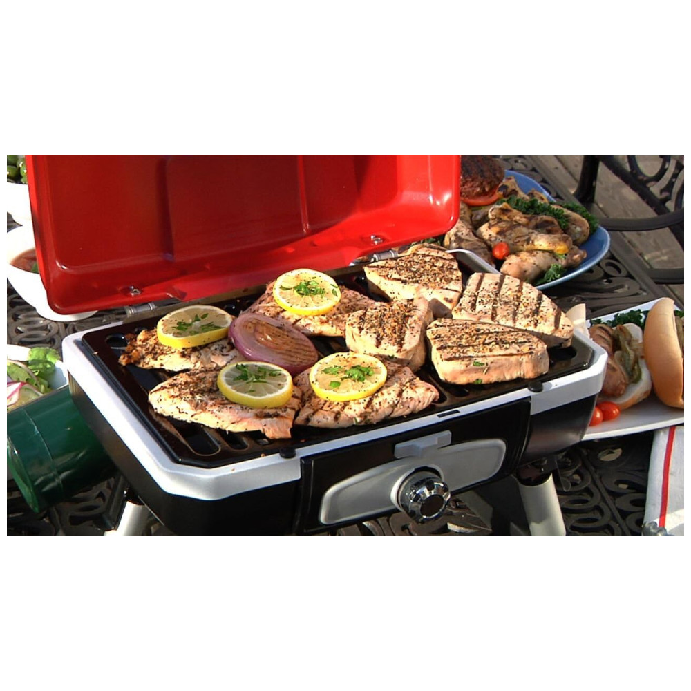 Grill, Churrasqueira a Gás Portátil, CUISINART CGG 180, Vermelho: GRELHA DE COZINHA ESMALTADA POR PORCELANA DE 160 POLEGADAS 160 polegadas quadradas de grelhas esmaltadas de porcelana oferecem uma superfície de cozimento espaçosa capaz de acomodar muitos alimentos de uma só vez, ao mesmo tempo que distribui o calor de maneira uniforme e eficiente.